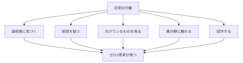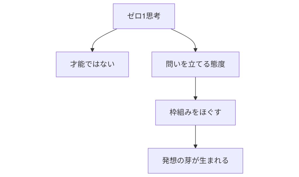 多くの人はゼロ1を「特別な人だけが持つ才能」と考えがちですが、実際には才能よりも“態度”に近いものです。日常の中で「あたりまえを疑い、問いを立てる姿勢」があれば、誰でもゼロ1思考を育てることができます。「なぜこれはこの形なのか?」「本当に必要なのか?」と問い続けることで、既存の枠組みがほぐれ、新しい発想の芽が生まれる土壌が整います。その“姿勢”を持てるかどうかが、ゼロ1思考を育てる第一歩になります。