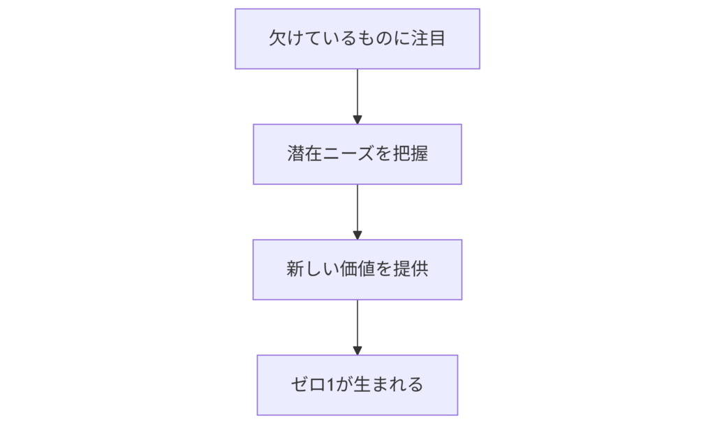 ゼロ1思考は、存在するものより「存在しないもの」に注目する姿勢から生まれます。たとえば「サービスが足りない」「人が困っている」「やりたいのにできない」という“欠けている部分”に目を向けることで、新しい価値を生むチャンスが生まれます。欠けているものは、誰かの“潜在ニーズ”であることが多く、そこにアプローチすることがゼロ1の原動力となります。