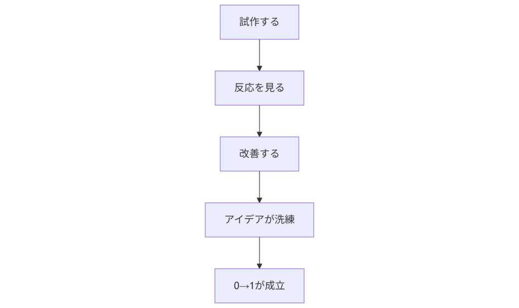 ゼロ1思考を持っていても、行動に移せなければ形にはなりません。そこで重要になるのが「小さく試す」「失敗を恐れない」という姿勢です。成功するかどうかは、実行してみなければわかりません。完璧を求めすぎず、まずは試作品や仮説を形にし、反応を見ながら改善することでアイデアは洗練されていきます。ゼロ1は机の上では生まれず、行動の中で磨かれるのです。