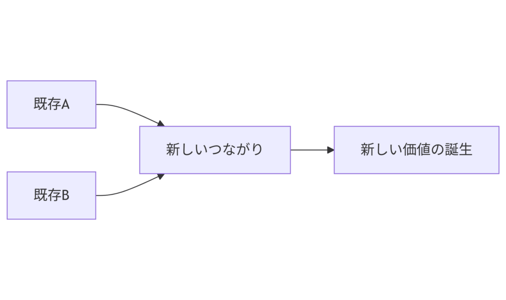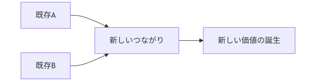 ゼロ1の発想は、まったく新しいものを「創る」だけではなく、“既存の要素を新しい形でつなぐ”ことでも生まれます。むしろ、全くのゼロから何かを作り上げることは稀で、多くの場合は「既存×既存」の新しい組み合わせがゼロ1につながります。そのため、物事を分断して捉えるのではなく、「つなげるとどうなるか?」という視点を持つことで発想が豊かになります。