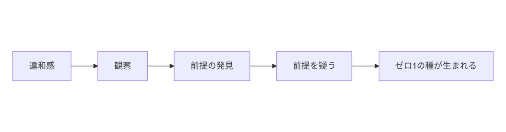 ゼロ1思考の大きな入り口は「違和感」です。違和感とは、概念の隙間にある“ほころび”のようなもので、そこに気づいたときに深掘りする習慣が重要です。たとえば、「なんとなくやりづらい」「みんなが困っている」「効率が悪い気がする」といった小さな感覚を、スルーせず観察することで、既存の仕組みの“前提”が見えてきます。その前提を疑ったときに、ゼロ1の種が生まれます。