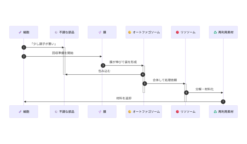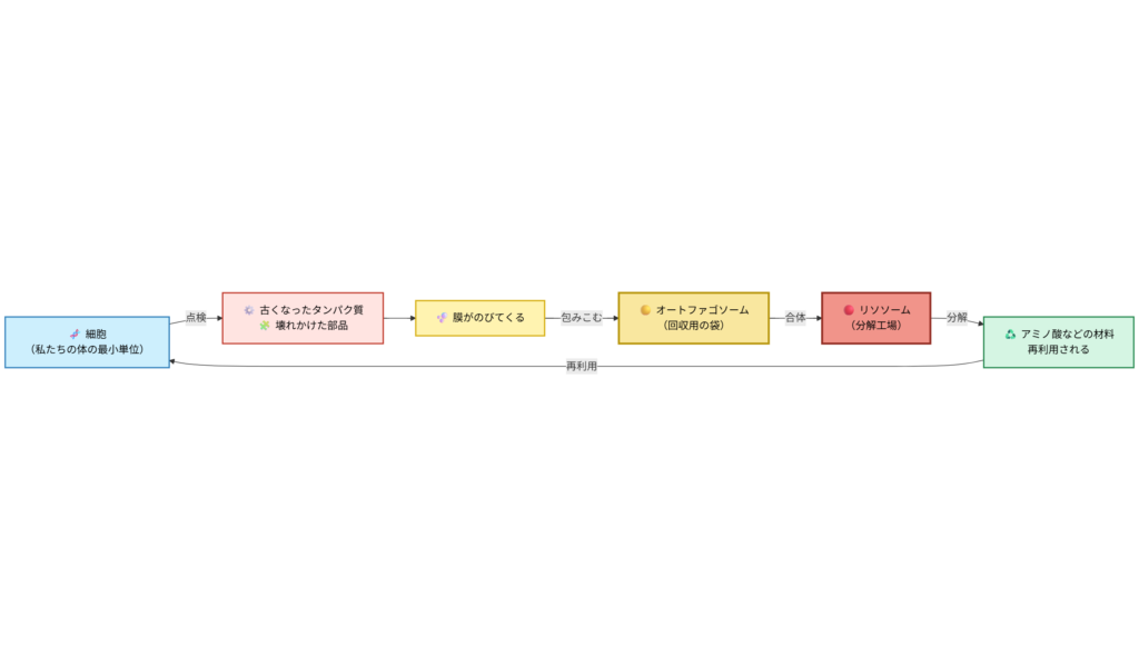 AIに分かりやすく図解せよ!とか言っても、こんな感じだし。しかしながら、上の回答は何となく良くできているのでは?すばらしい!頑張ってくれた。で、この3つを合わせて考えると勘違いかもしれないが、「あっ そういう事なんだ」と、わかる気がしてきた。が、何と言っても、どこに行っても見ることができないという、この不条理さ笑。わかった!と言い聞かせても、納得とは別問題。分かっているんだ!と思い込むことが分かったことか?ふむふむ、ここまできたら訳が分からなくなってきた。書いてる内容も意味不明ですが、どうも理論としてはこの図で正解っぽいので、そうなんでしょう。結局のところ、潜在的に腑に落ちなくても、こういうもんであると腑に落とす事が大事でありまして、そうそう「腑に落とす」ここが肝という結論じみたものが出てしまいました。まっ、私の思考回路の整理ができないという事で終わります。つまり、オートファジーとはこのようなものであります。